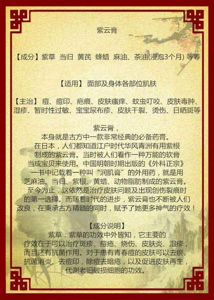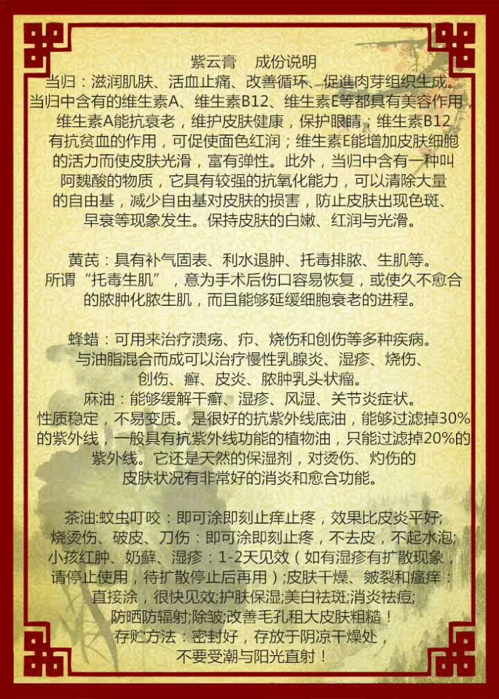 紫草油是利用紫草、冰片、蜂蜡、香油为主要原料。依据清热祛火毒、活血生肌、祛腐的理论配伍,以紫草为主要成分配制而成的中草药制剂,具备止血、凉血、活血、生肌、祛腐滋润的功效。芝麻油是半乳化状态,无吸水作用,亦不影响水分挥发,故不会造成局部皮肤潮湿或干燥皲裂。