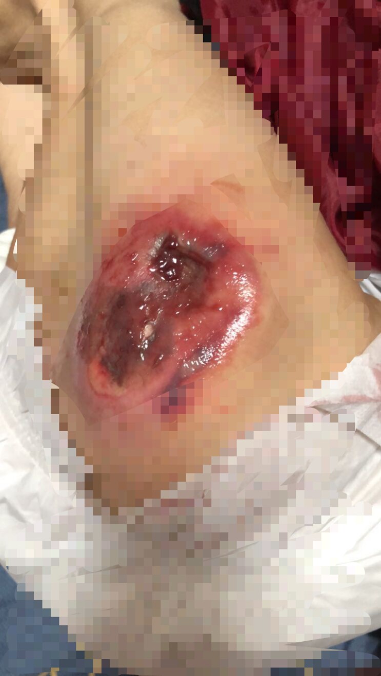 期压疮以无菌注射器抽出水泡内液体;、期压疮有脓性分泌物者先用3%过氧化氢液冲洗创面,再用无菌生理盐水清洗,然后以无菌镊子或剪刀清除坏死组织。创面常规处理后,以紫草油纱布覆盖创面,并以无菌敷料包扎;换药1次/天。