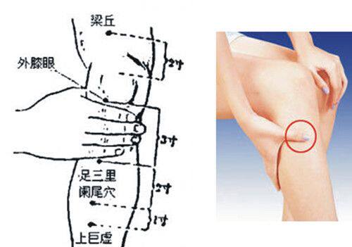 坐于床上,两膝关节自然伸直,用拇指指腹揉按同侧的足三里穴上,