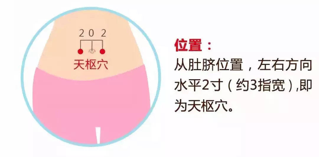 同上坐姿,双手叉腰,中指指腹放在同侧的天枢穴上大拇指附于腹外侧,