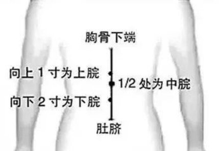 左手的掌心紧贴于中脘穴上,适当用力揉按30~50次。