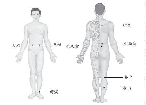 选取肾俞、大肠俞、关元俞这三个治疗腰痛的特效穴位并可配合天枢、承山、