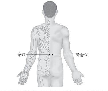 用一只手的拇指按住肾俞穴。该穴在第二腰椎棘突下,即命门穴的外侧1.5寸处。