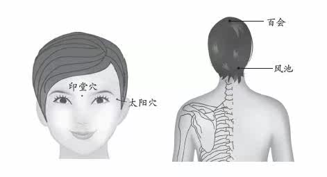 (1)按压头顶的百会穴、印堂、太阳、风池穴各30-50次,力度以酸痛为度。